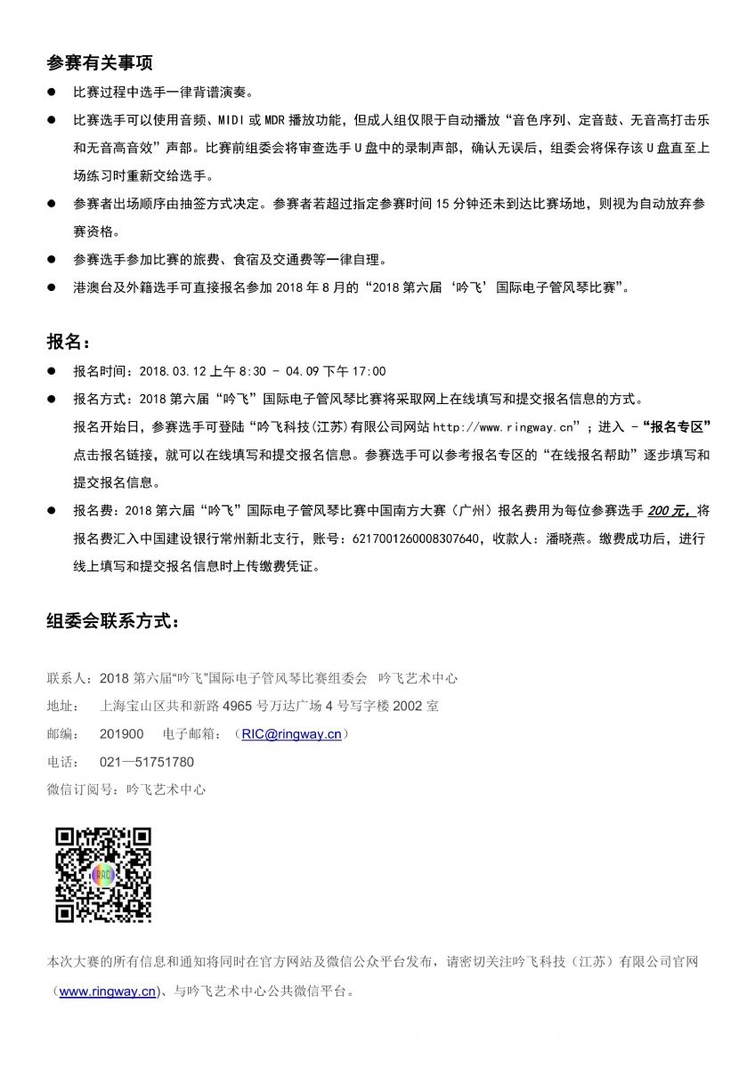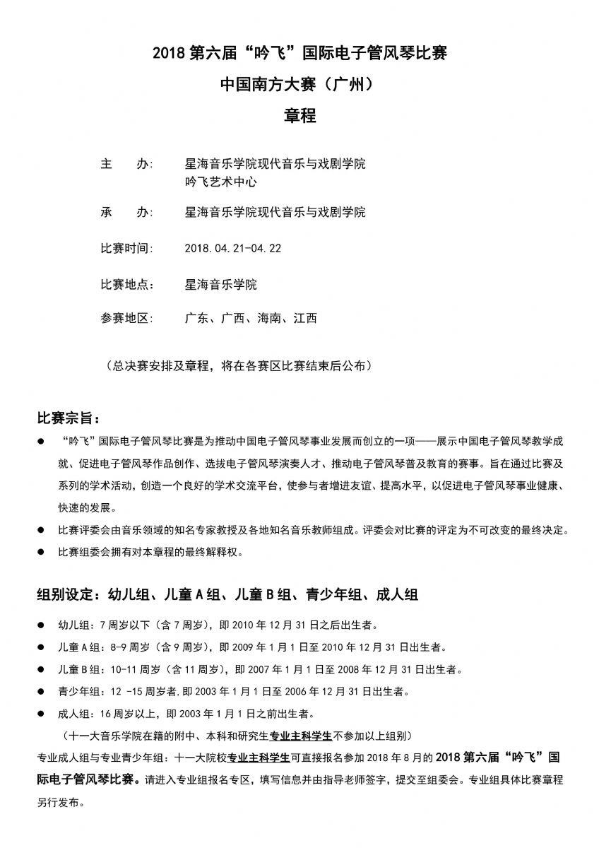 2018第六屆“吟飛”國際電子管風琴比賽中國南方大賽(廣州)賽區參賽指南和詳細賽程稍后也將發布,請隨時關注“吟飛科技(江蘇)有限公司官網just9229.cn”和“吟飛藝術中心”微信公眾號。